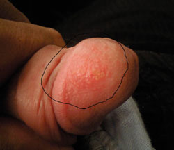包皮和龟头红点,表面光滑,并有小疱疹,红斑的边缘较清楚,急性发作时有糜烂、渗液。【